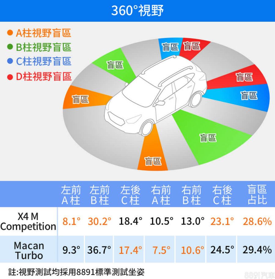 雖說X4 M在後方視野表現表現不佳,但環艙視野也就是A、B、C柱的遮擋並不會太明顯,與Macan Turbo 相較,兩車環艙視野表現相當、互有勝負,實際計算盲區占比,X4 M甚至表現比起Macan Turbo 再好上些許,以五門車體來說這樣的表現還算可以接受。