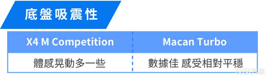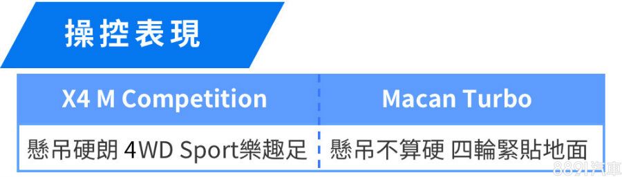 X4 M Competition駕駛坐姿重心較高,但只是一種駕駛感,激烈操駕時,仍有人車一體的感覺。另外,X4 M Competition懸吊阻尼比Macan Turbo硬朗,提供優秀的側向支撐性,車身出現滑動時,可以清楚知道,進而更快速、精準的做出修正,讓人可以更放心的探究底盤極限,做出更激進的操駕測試。