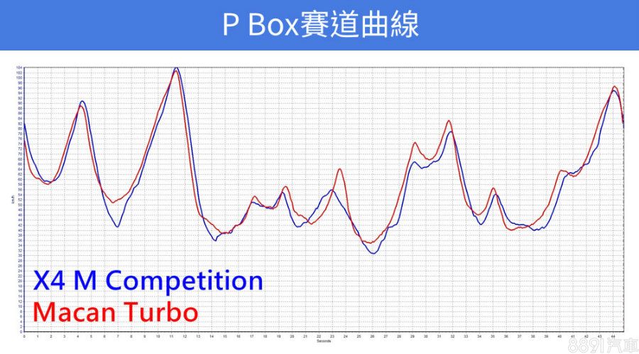 最後,Macan Turbo跑出44.7秒最速單圈,比X4 M Competition微快0.1秒,從P Box曲線可以看出,雖然X4 M Competition有強悍的動力,但在小場地難以發揮,直線太短,並沒有取得優勢,反而因前輪狀況不盡理想,影響了彎中速度,實在有些可惜。
