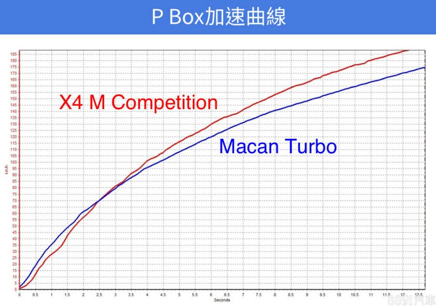 從P Box曲線可以了解到,Macan Turbo靠著PDK變速箱能實現離合器瞬間接合的彈射起步,在靜止起步至70km/h之前都能佔上風,之後才讓動力更大的X4 M Competition超越,隨後差距逐漸拉大,直至400m終點。