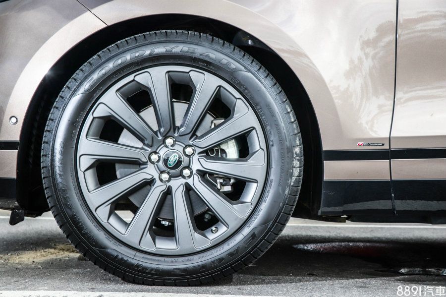 試駕車標配20吋鋁圈,配胎尺碼為255/50R20,造型上雖然沒有太多性能氛圍,但卻相當匹配Velar圓潤而飽滿的外型,原廠更提供21吋鑽石切削鋁圈供選配。所搭配輪胎為固特異Eagle F1 AT細花休旅車胎,並不特別強調操控與抓地性能。
