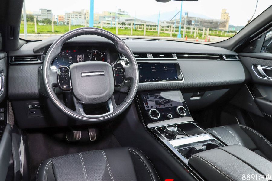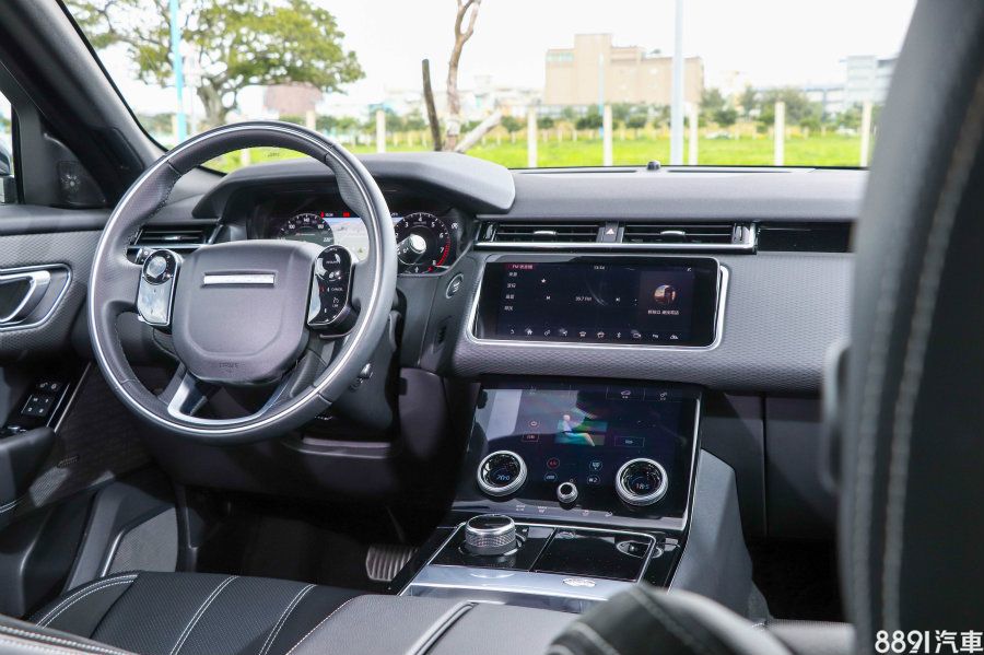 Velar的內裝配置達到前所未有的簡潔感,儀表檯除了雙旋鈕、音量鍵以及旋轉式排檔基座之外,沒有任何實體案件可供操作,這套Touch Pro Duo雙觸控螢幕基本掌握全車所有大小控制,包括音響、空調、導航、越野模式、懸吊高低等都在觸控螢幕中完成。
