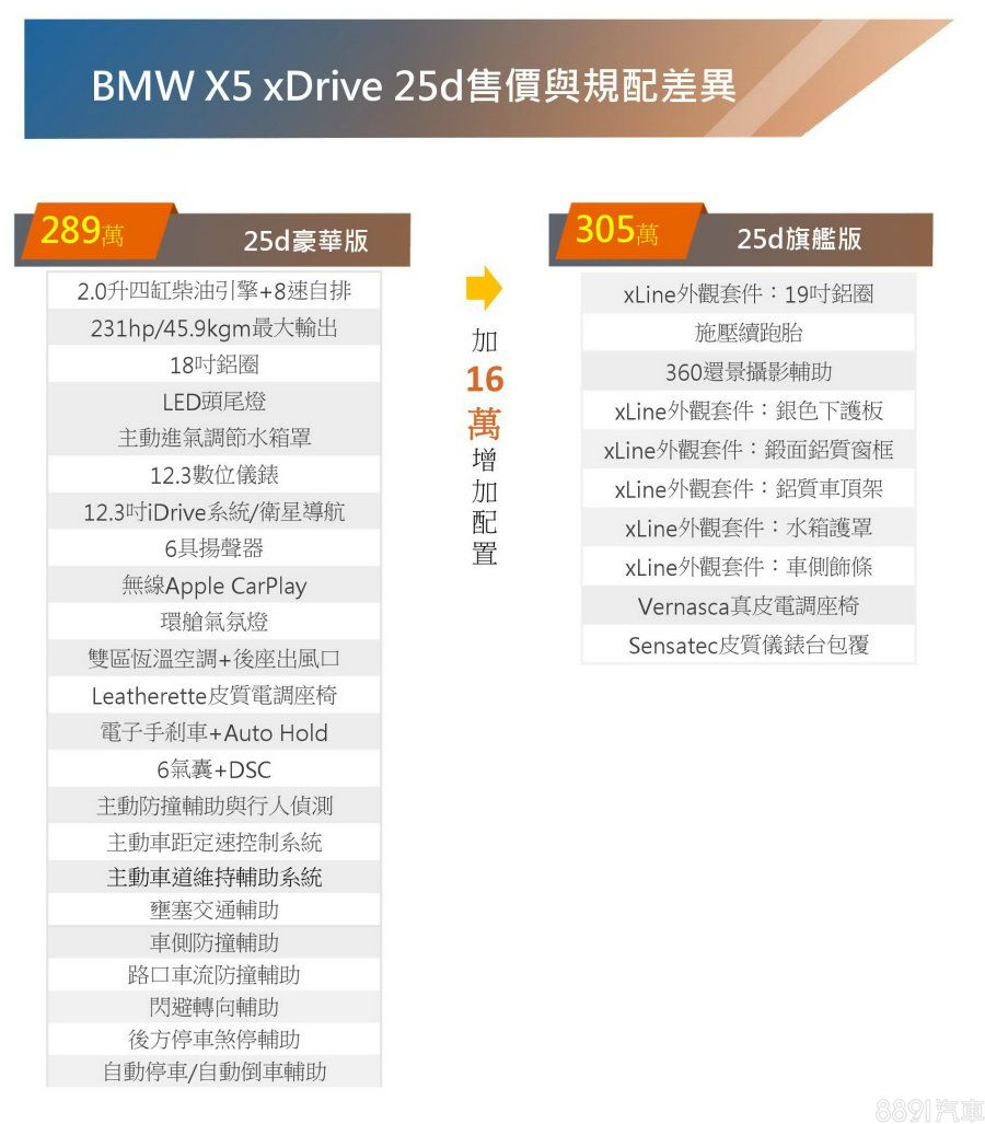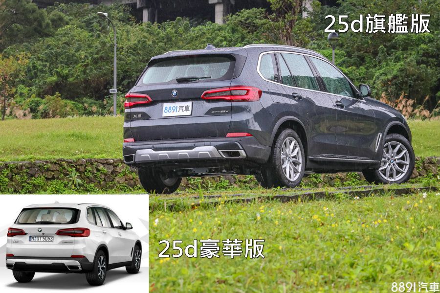 2.0升柴油X5共分為xDrive 25d豪華款、xDrive 25d旗艦款雙車型,售價分別為289萬元、305萬元;本次試駕車為高規旗艦款,相較入門車型外觀多了xLine風格套件,於保桿、車側等處多了霧銀飾板裝飾,這也是近年新世代X家族才出現的配件,有別於M Sport的運動感,xLine看起來更有戶外風格,細節也更豐富一些。