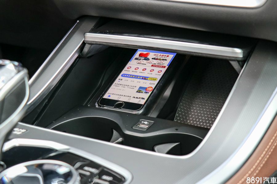 排檔座前為隱藏式置物空間,上蓋翻起阻尼頗重,加上鋁合金飾板冷冽的觸感,操作感相當不錯,內藏兩處置物空間,放手機剛剛好,可另外選配無線充電裝置,配合無線CarPlay會更好用。