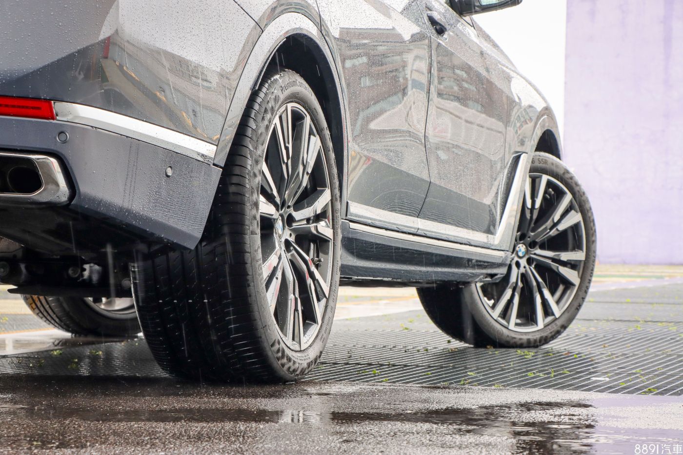 呼應壯碩的車身,X7標配機械感十足的22吋鋁圈,採用前275/40R22、後315/35R22馬牌PC6原廠認證胎,在定位上屬於兼具性能的道路用胎,但由BMW與馬牌偕同開發,以符合X7龐大重量與性能需求。