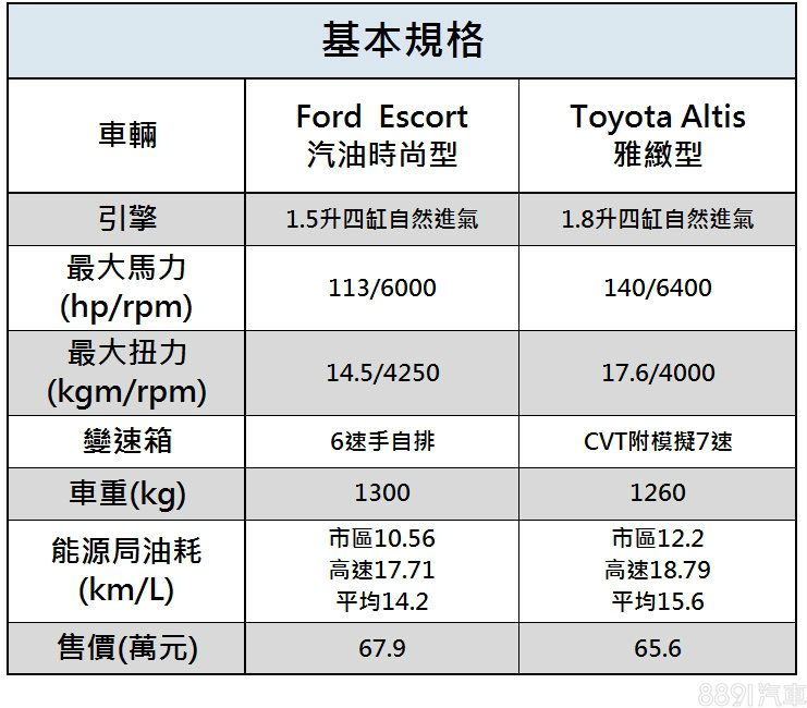 這次以Altis為油耗競爭對象,理應上兩者並非直接對手,定位較次一階的Escort,實際規格相比,便會發現Escort在車身重量並未太佔有優勢,反倒比起Altis還「胖」了一點點,因此Escort14.2km/L的平均油耗,還略遜於Altis的15.6km/L,另外需說明的是,Altis試駕車為15吋胎的雅緻型,不過16吋版本的原廠油耗數據皆相同,因此理論上車型差異不對實測造成影響。