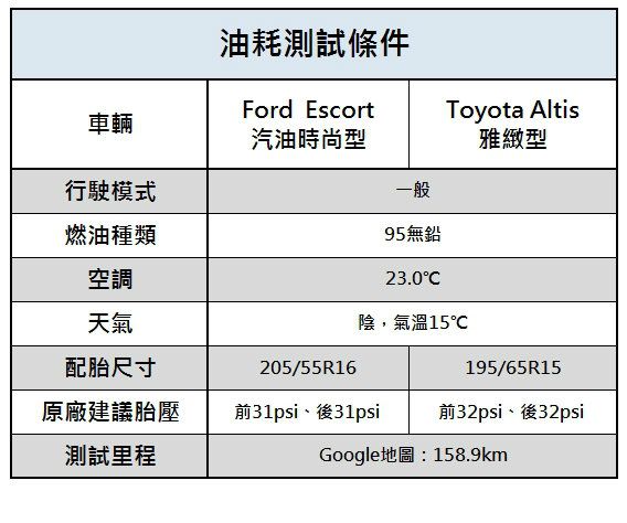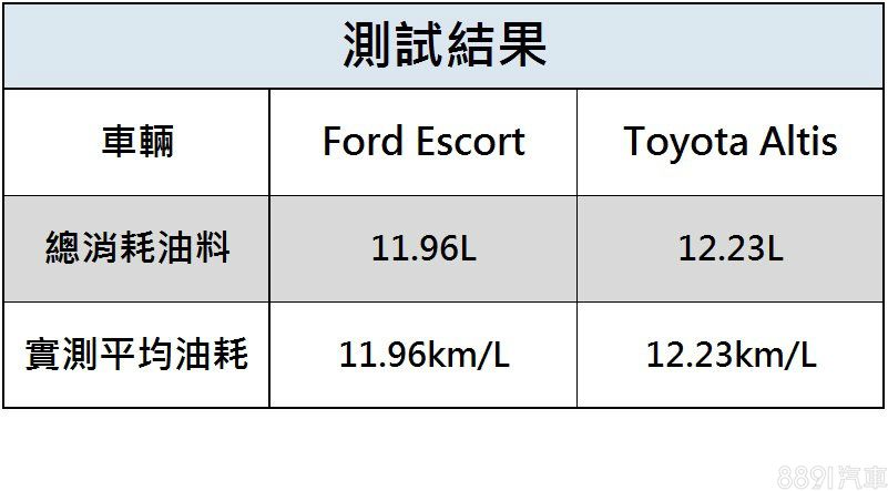 經此回實測,結果和能源局數據的狀況相同,雖然差距甚小,但總得分出高低,排氣量較小的Escort對比Altis沒太大優勢,比節能,由神車獲勝!