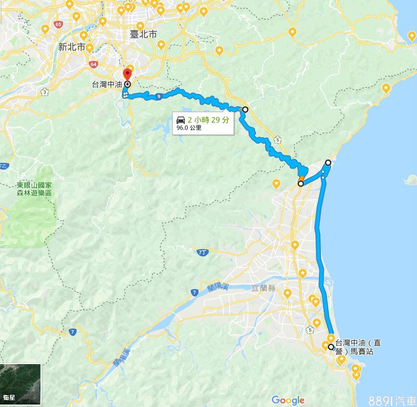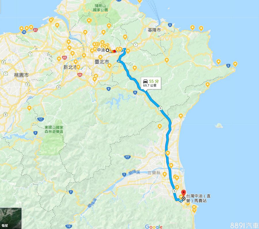 從台北民權東路上的中油加滿油後,自內湖匝道接上國一出發,短暫經由國三再轉國五一路向終點蘇澳前進,Google里程估算約為69.7km,預計一小時內可抵達。