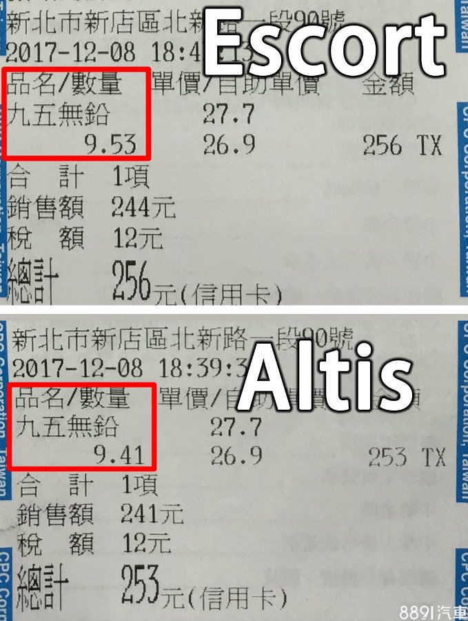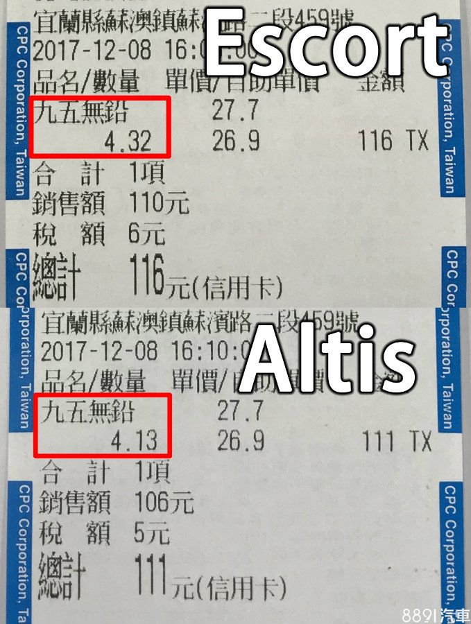 市區路段的實際成績,Escort加了9.53L,以Google里程的96km為基準計算,得出市區10.07km/L的實測油耗,而Altis添補9.41公升,相同基準換算得出10.20km/L的成績。