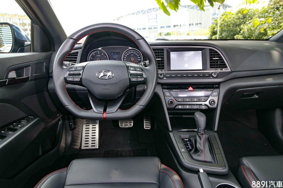 Elantra Sport內裝也有專屬設計,且元素與Focus ST Line相同,像是平底方向盤、紅色縫線、碳纖維紋路飾板,而方向盤的運動氣息最為濃郁,用在純種跑車上都合適!