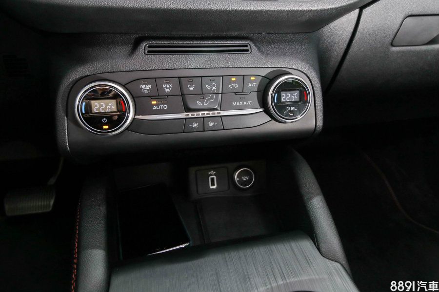 Focus配置的雙區恆溫空調,Auto模式有三段選擇,會將風量進行強、中、弱設定,可依喜好進一步更細膩的設定,這是對手缺少的小細節。下方是無線充電區域,是三車獨有,便利性加分許多,旁邊還是USB與12V電源,位置規劃也相當得宜。