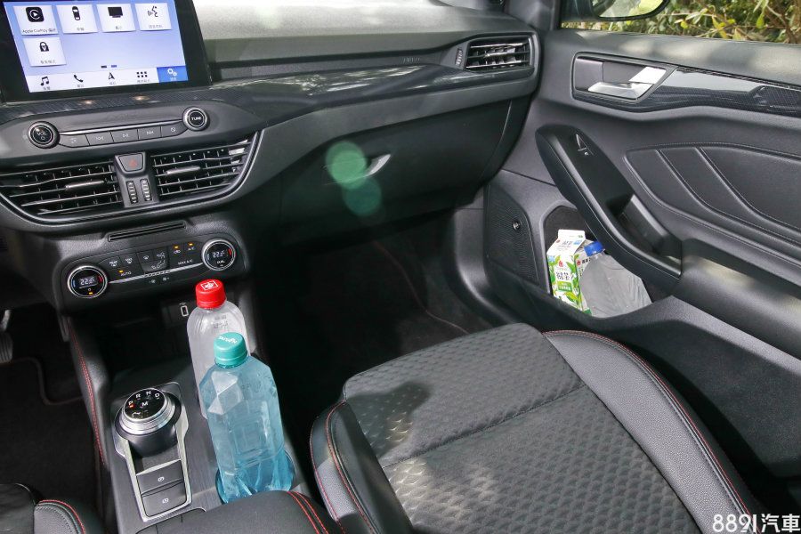 Focus前座中央杯架設計理想,擺放飲料後不影響旋鈕式排檔,加上底部有藍色氣氛燈,夜晚會由下向上透光,讓整罐礦泉水都會發光,頗有氣氛。另外前門板可容納兩罐方形飲料,也是三車最佳者。
