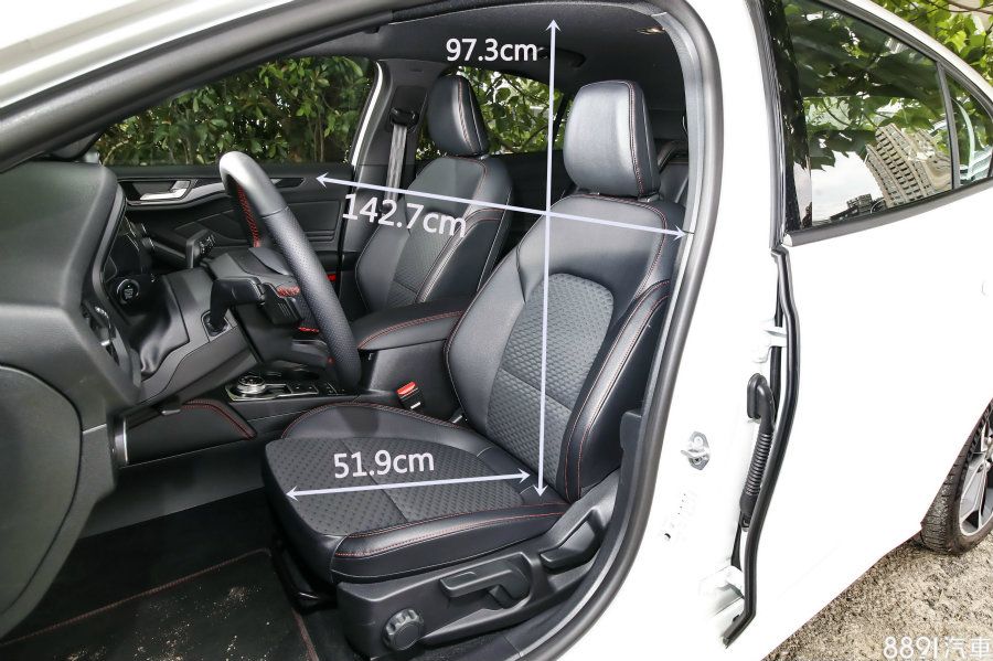 Focus ST Line座椅材質為織布、皮革交錯搭配,質感中等,包覆性設計也無突出表現,倒是椅墊高低可以針對腿部、臀部分開調整,讓坐高與腿部支撐性各自有良好適應性。