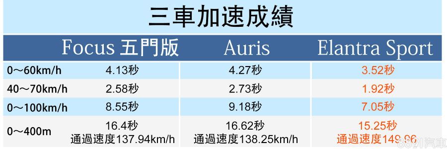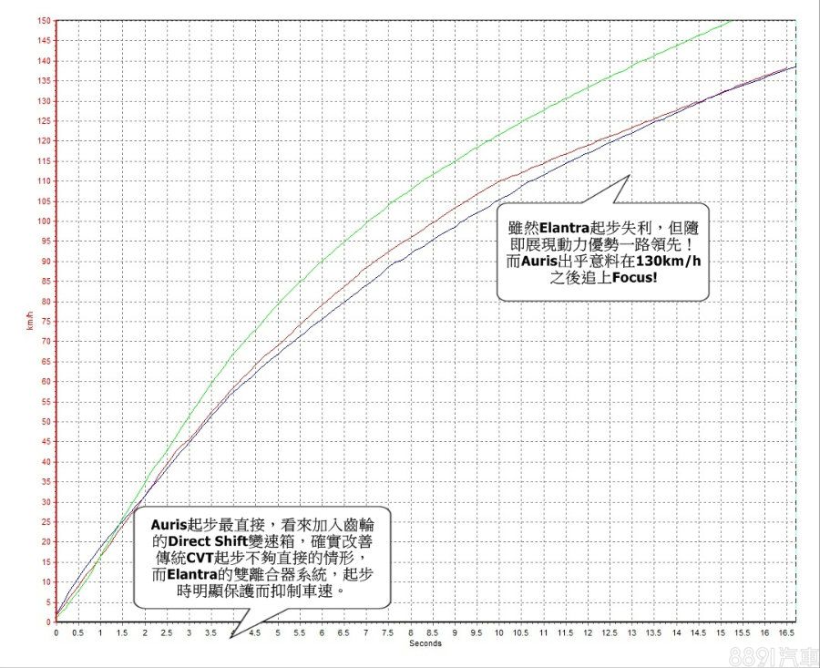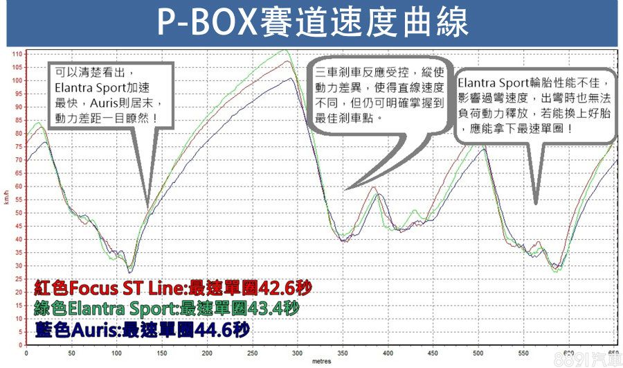 這是P Box紀錄的速度曲線圖,紀錄三車賽道上的速度變化,Focus ST Line配胎等級高、懸吊設定精良,加上不差的動力,拿下最速紀錄不讓人意外;Elantra Sport敗在輪胎等級不高,否則有機會超越Focus ST Line!加速表現 Elantar Sport一路領先、Auris緊咬Focus