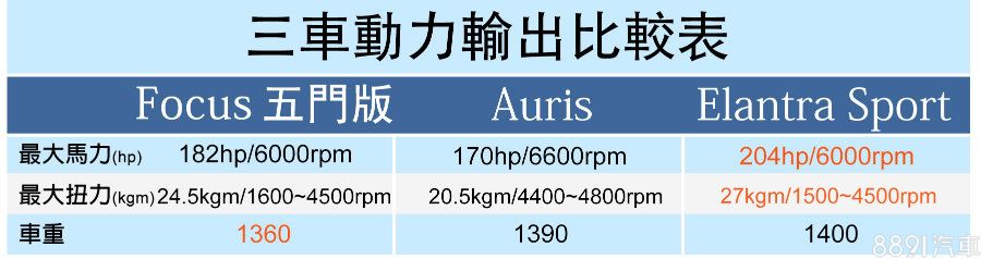 三部車引擎各有特色,其中又以Focus的1.5升三缸渦輪最具話題,力求在節能與輸出取得雙贏,而Elantra Sport的1.6升渦輪引擎則有最強悍動力,204hp/27.0kgm確實帶有一絲性能色彩,至於Auris,是豐田最新的自然進氣技術,效率與科技性也都頗高。