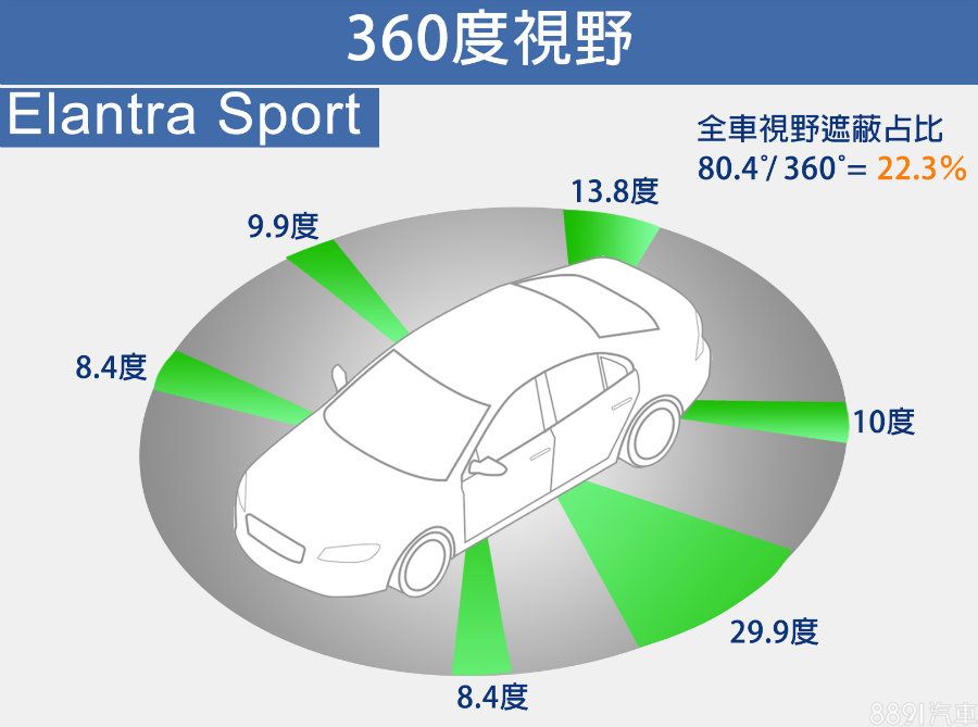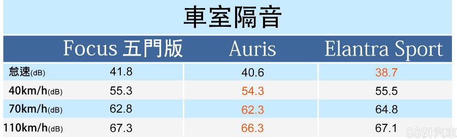 Elantra Sport視野遮蔽情形明顯小於另外兩車,幾乎每一處A、B、C柱遮蔽角度都較小,在於停車、窄巷行駛時,都更能掌握車身四周狀況。車室隔音 Auris數據最出色