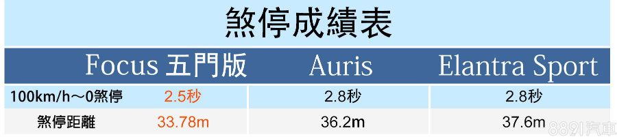 Elantra Sport雙離合器變速箱有些許保護,使得起步動作是最慢的,但20km/h之後車速扶搖直上,至此一路領先!不過有趣的是,Auris看似加速最慢,但120km/h之後追上Focus,看來新世代2.0升自然進氣引擎在高轉速表現上仍有強處。煞停測試 Focus ST Line表現超優秀