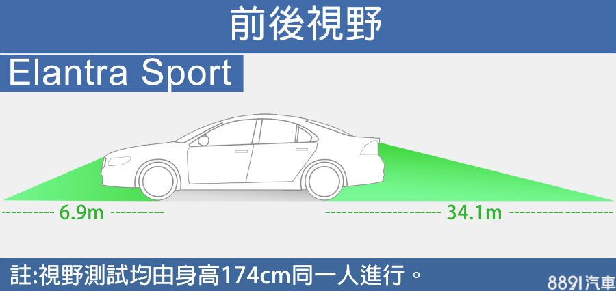 Focus前後可視距離是三車最短者,最能掌握前後狀況,Auris表現則位居第二,而最值得一提的是Elantra後方表現,居然長達34.1公尺,這主要是房車後擋風玻璃明顯較傾斜,下緣不夠低,因此影響後方視野,這主要是房車與掀背車在車體上先天差異所致。