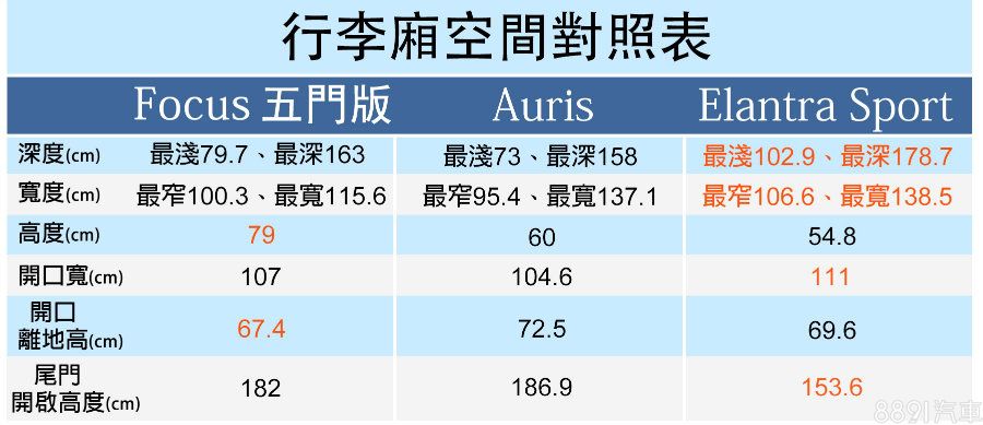 從測量數據來看,Elantra行李廂空間最佳,但實際上牽涉到五門掀背、四門房車的車體差異,若要說運用的靈活機能性上,其實是Focus最理想!