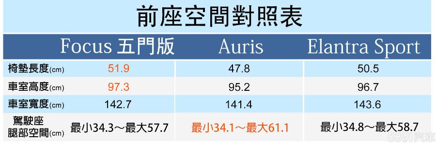 Focus前座椅墊最長,自然可以有更理想的大腿支撐,同時車室高度也最高,有利頭部伸展;但若要說橫向寬度,則是Elantra最出色;Auris只有在駕駛座前後距離上,有最大的調整範圍。