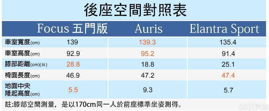 在數據上,Auris後座寬度、高度都居冠,但膝部空間狹小、地板中央也最高,坐在後座其實頗為侷促,且後門開啟角度也小,上下車順暢性實在不理想。