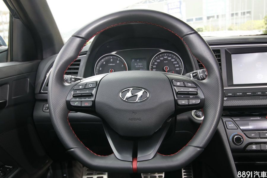 不得不再一次稱讚Elantra Sport的方向盤,平底、下方金屬裝飾、紅縫線,運動氣息強啊!握感也沒話說!至於兩側按鍵,因沒有主動安全防護系統,因此就是常見的音響、定速、儀錶多功能螢幕的操作。