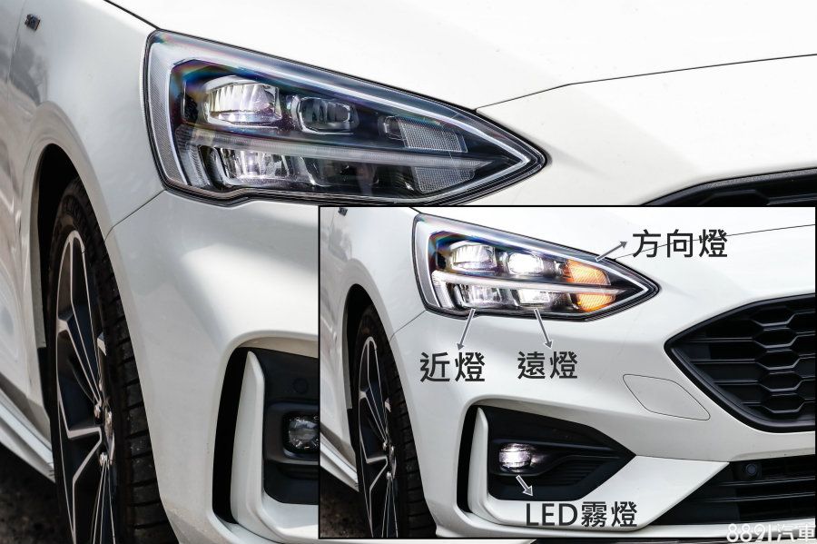 兩條LED日行燈一明、一暗,辨識度頗高;LED頭燈為單顆魚眼,直接切換遠近光,並與Focus ST Line同樣有自動遠燈功能,但水平調整卻是手動,便利性小扣分。