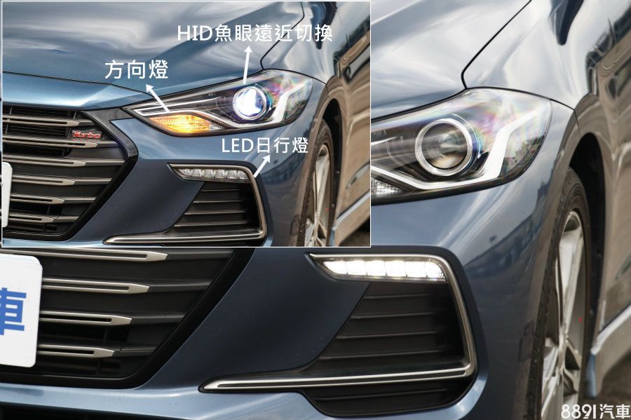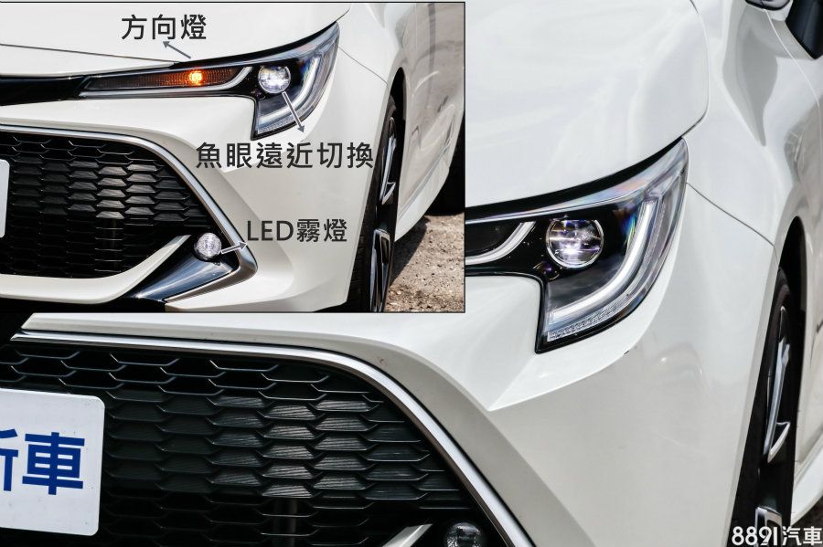LED日行燈獨立在保桿上,頭燈為魚眼HID,科技性自然是比不上另外兩車的LED頭燈,同時也無自動遠燈功能,亦缺乏霧燈,因此頭燈功能性、炫目度都是較為遜色。