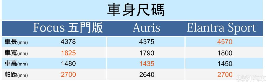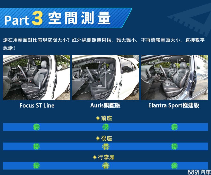 三車都是中型級距,但Elantra Sport多了一截屁股,車身自然長了一點。Auris軸距比另兩車短了60mm,必然會造成車室空間差異,差多少?往下看實際測量?!內裝