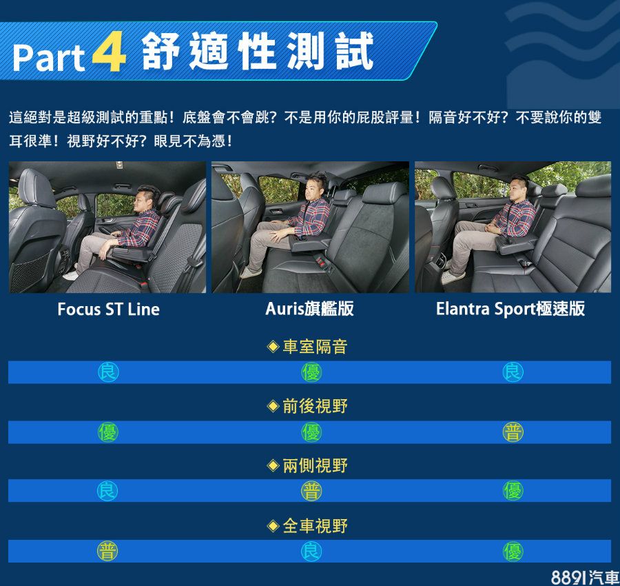 雖然Elantra Sport座椅造型看起來一般,但座椅腰部、腿部兩側包覆性經過強化,實際包覆性也不輸Auris,且是三車唯一有電動調整功能,加上前車室橫向最為寬敞,舒適感可說是三車最好的。