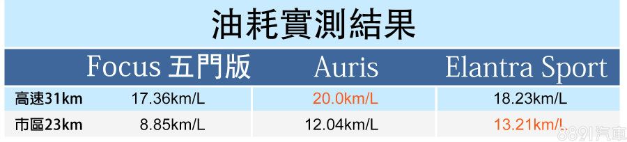 實測成績有點出乎意料,Focus ST Line市區表現有明顯差異,還好高速表現稍微拉近距離,而Elantra Sport市區油耗則是讓人出乎意料,高速也不錯,不過Auris的20.0km/L才是真正讓人跌破眼鏡,再次呼應一般對於「豐田很省油」的印象!