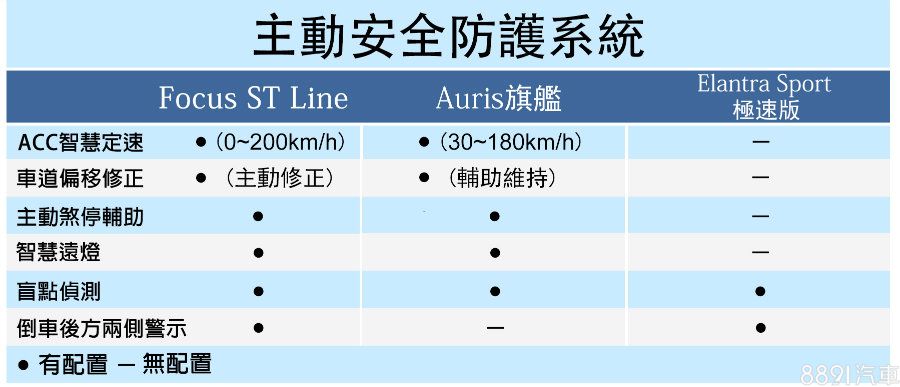 在主動防護配備上,Elantra Sport可說是完全居於弱勢,而Focus ST Line的完整性、功能健全度又比Auris出色,因此在這部分,Focus ST Line是拿下滿分!