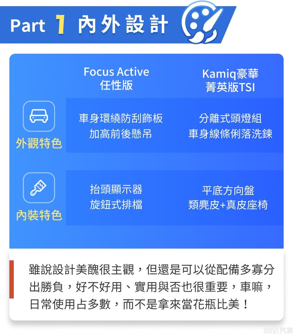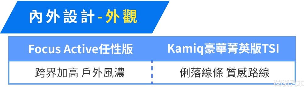 原本是標準掀背車型的Focus,靠著懸吊加高、外觀小幅修改,搖身一變成為跨界CUV,對比之下,Kamiq從開發之初便定位在跨界CUV,誰最正統?這並沒有結論,不過兩車同樣有著高底盤設定、車身尺碼相近,也都訴求更好的實用機能與豐富用車體驗,讓Focus Active與Kamiq成為最直接的競爭對手。