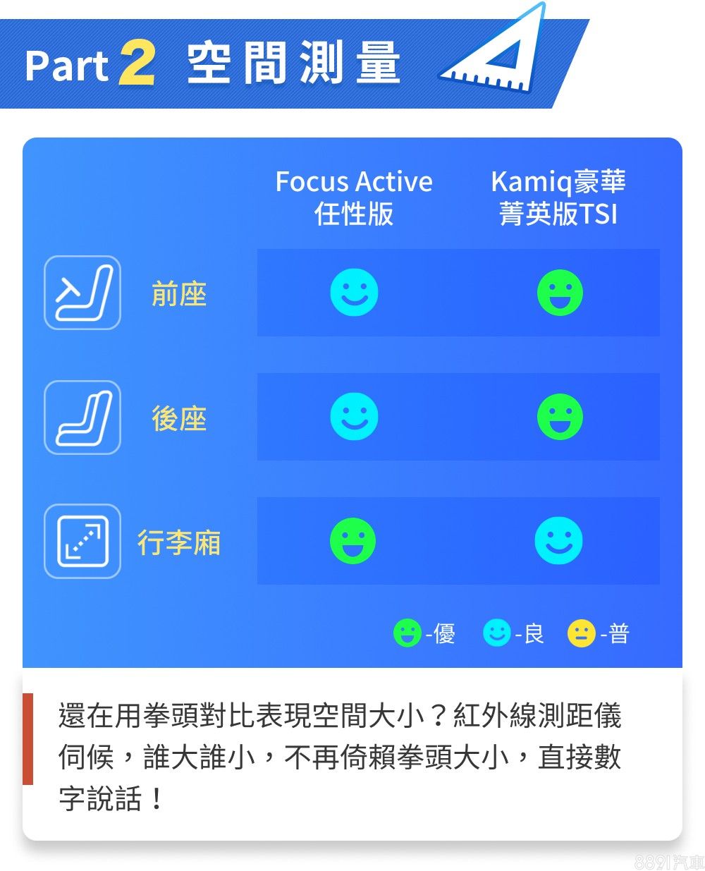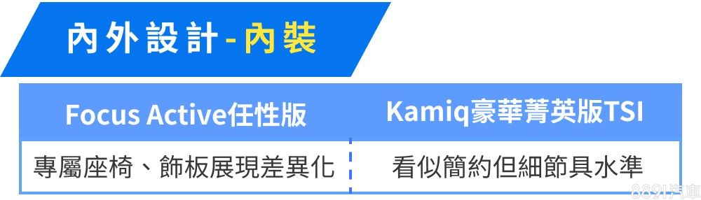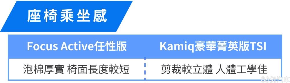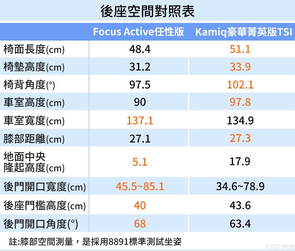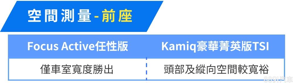 Focus Active的車身尺碼比起Kamiq來得大,但經過實測並未完整反應在座艙空間,高度、縱向空間都是Kamiq較為充裕,Focus Active則主要在前座寬度比Kamiq寬4.3cm。簡言之,Focus Active在車室寬度勝出,Kamiq則是頭部與膝部空間較好。