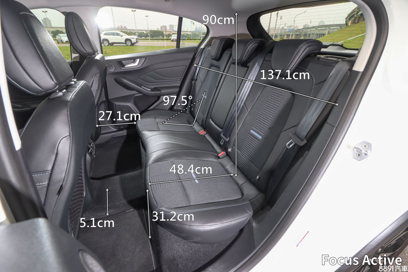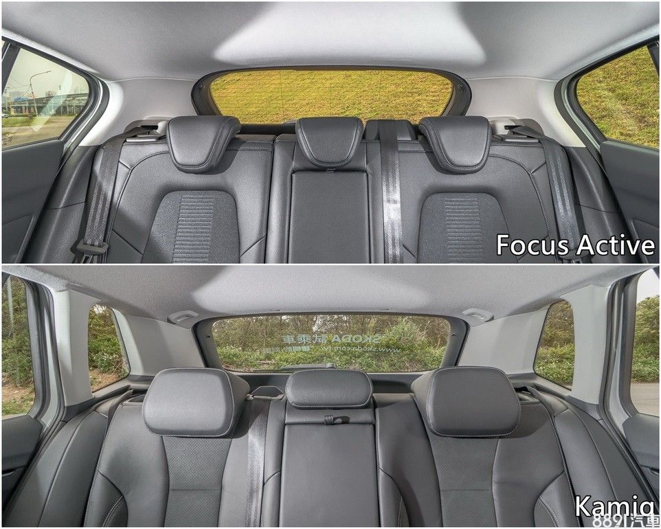 Focus Active後座椅背較挺直,加上車頂向下傾斜的關係,頭部空間不如Kamiq,不過中央地板隆起低,能讓中央乘客多點舒適性。