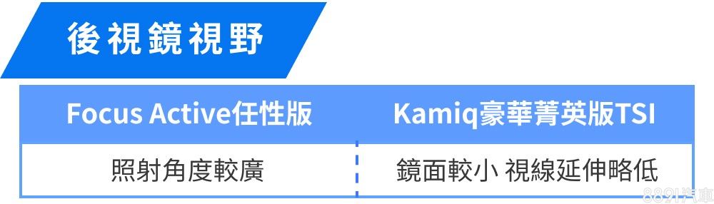 雖然兩車的後擋玻璃面積都不算大,但Kamiq受到較高腰線的影響,是導致後視野較差的主要原因,而Focus Active在車頭較低扁、整體車高較低的情況下,前後視野盲區皆較Kamiq來的小。
