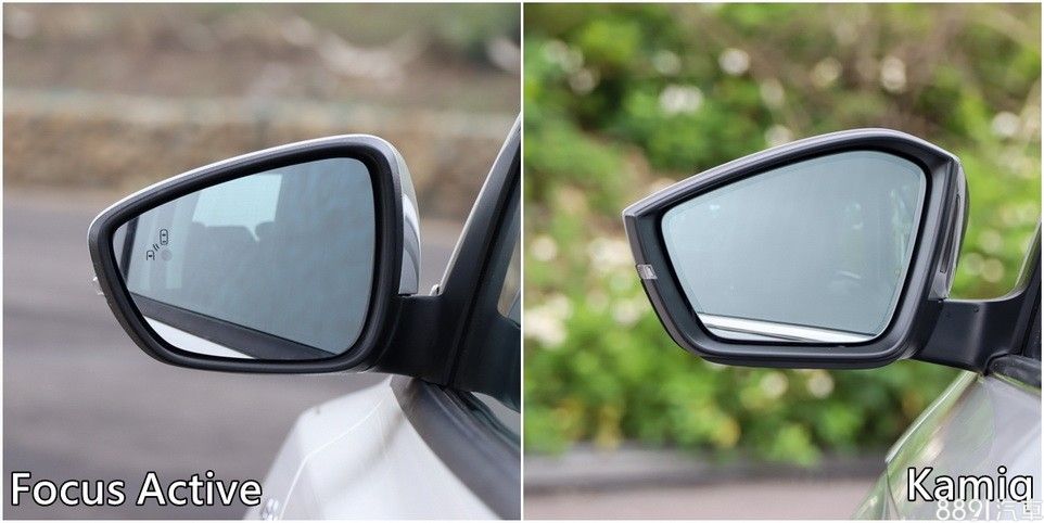 兩車後視鏡都沒有廣角設計,雖然鏡片造型看似差異不大,但Focus Active在外側較為延伸,帶來更開闊的照射範圍。兩車皆有盲點偵測系統,不過Focus Active是整合在鏡面內,Kamiq則是設計在後視鏡外殼內側,燈號明顯辨識度較高。