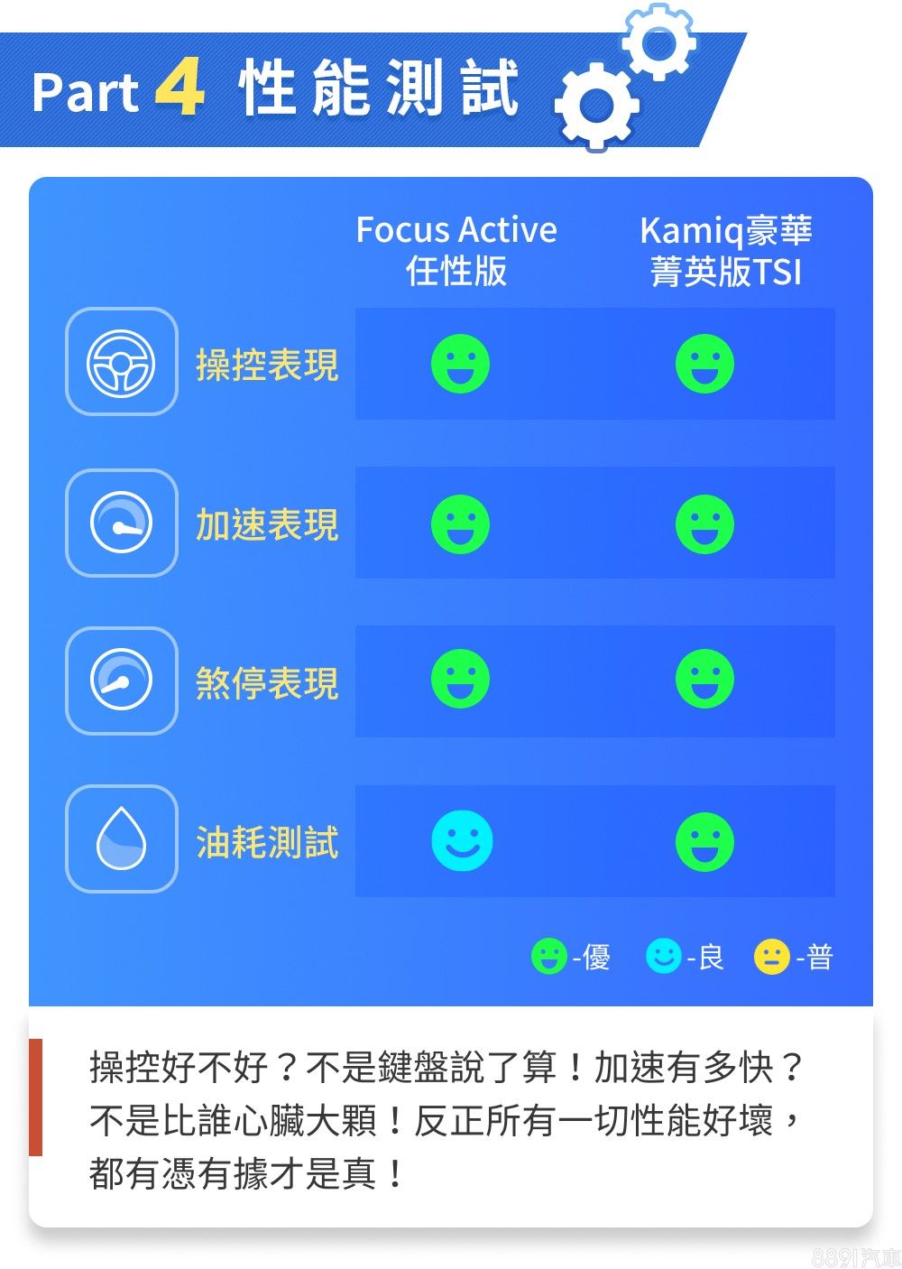 掀背車格改造而來的Focus Active,原以為加高車身會影響操控,不過實測後依舊承襲掀背的運動色彩,比起Kamiq多了點靈活性,實際賽道表現也亮眼。相對運動化的懸吊設定,則讓震動測試成績遜於對手,路感更為鮮明,且行駛中底盤與風切聲噪音較明顯,整體舒適性表現不如Kamiq來的出色,但如果你是喜歡小休旅卻不想妥協操控的買家,那Focus Active很適合你。