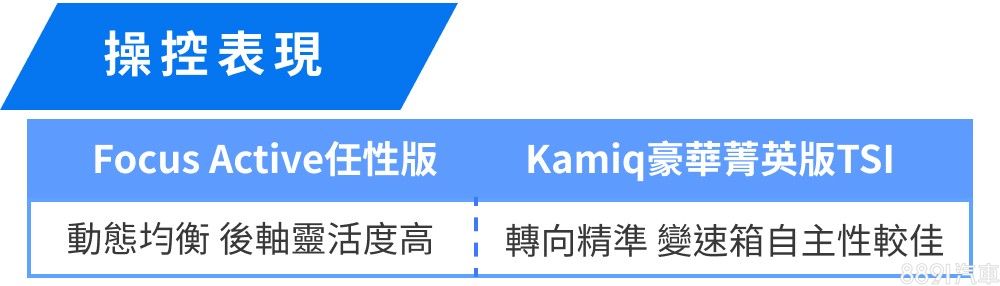Kamiq後懸吊結構為非獨立式,與對手的多連桿截然不同,理論上,非獨立式因左右牽連,搖晃會比較明顯,但實際上Kamiq車尾動態相當安穩,與Focus Active的活潑有明顯差別;另外可能是DSG變速箱傳輸直接,或是底盤整體設定的差異,Kamiq出彎時,前輪空轉程度明顯高於對手,必然會影響速度發揮。兩車操控特性不同,若要說欣賞誰,我們投給Focus Active!