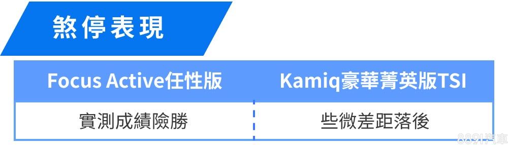 分析實測數據,起步Kamiq稍有領先,Focus Active則在百公里加速略勝一籌,一旦車速來到100km/h以上,Kamiq又稍稍拉開差距,最終零四以16.42秒、通過速度141.13km/h勝過Focus Active。可以看出兩車加速成績互有勝負且差異微小,小到可以算是環境測試誤差也不為過,因此兩車加速能力算是在相同水平。