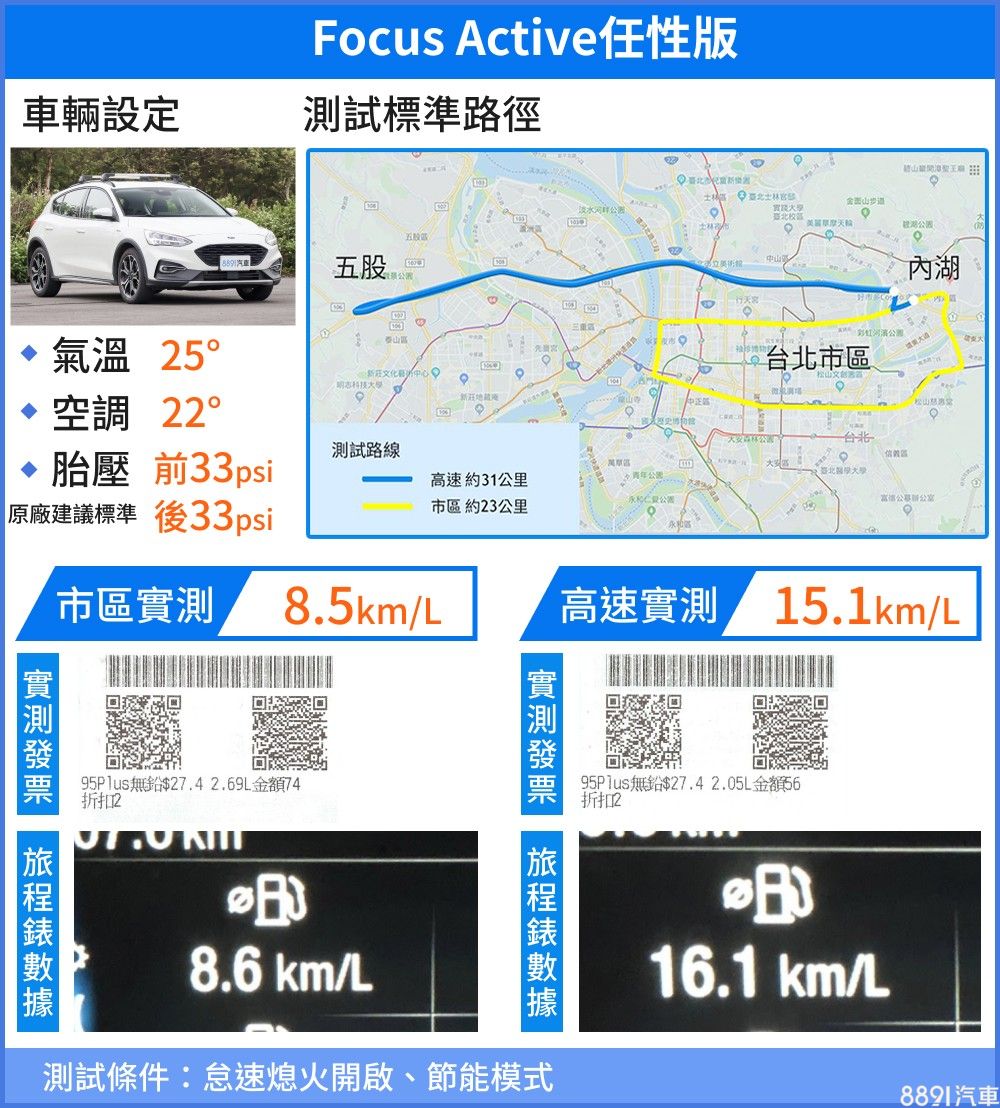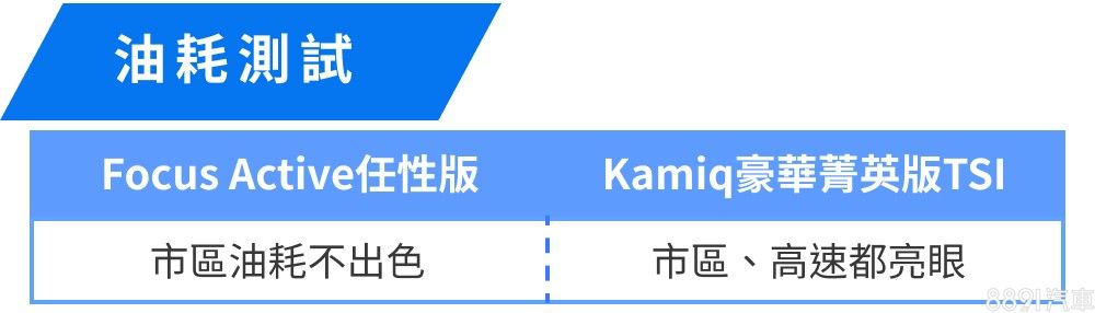 不論市區或高速油耗實測,都是由Kamiq勝出,雖然兩車都擁有節能模式、怠速熄火,甚至是汽缸休止這高科技配備,在節能科技上兩車都十分豐富,但不論是停停走走的市區或高速路段,Kamiq的DSG變速箱確實發揮優勢,升檔積極且動力流失少、效率高,在油耗測試中完勝Focus Active。