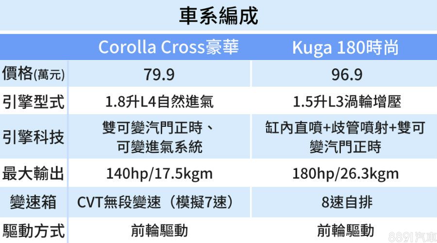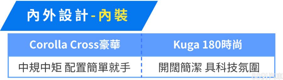 Corolla Cross以主力的豪華型參戰,售價訂在極具競爭力的80萬元,基本上可以視為一輛「墊高版Altis」, 配置幾乎比照辦理。Kuga 180時尚雖然價差17萬元,但換得大一號的空間、大很多的動力以及更多舒適性配備,理當在超級測試各項目之中會更佔優勢。然而兩輛大小休旅究竟差距會多大?測了才知道!