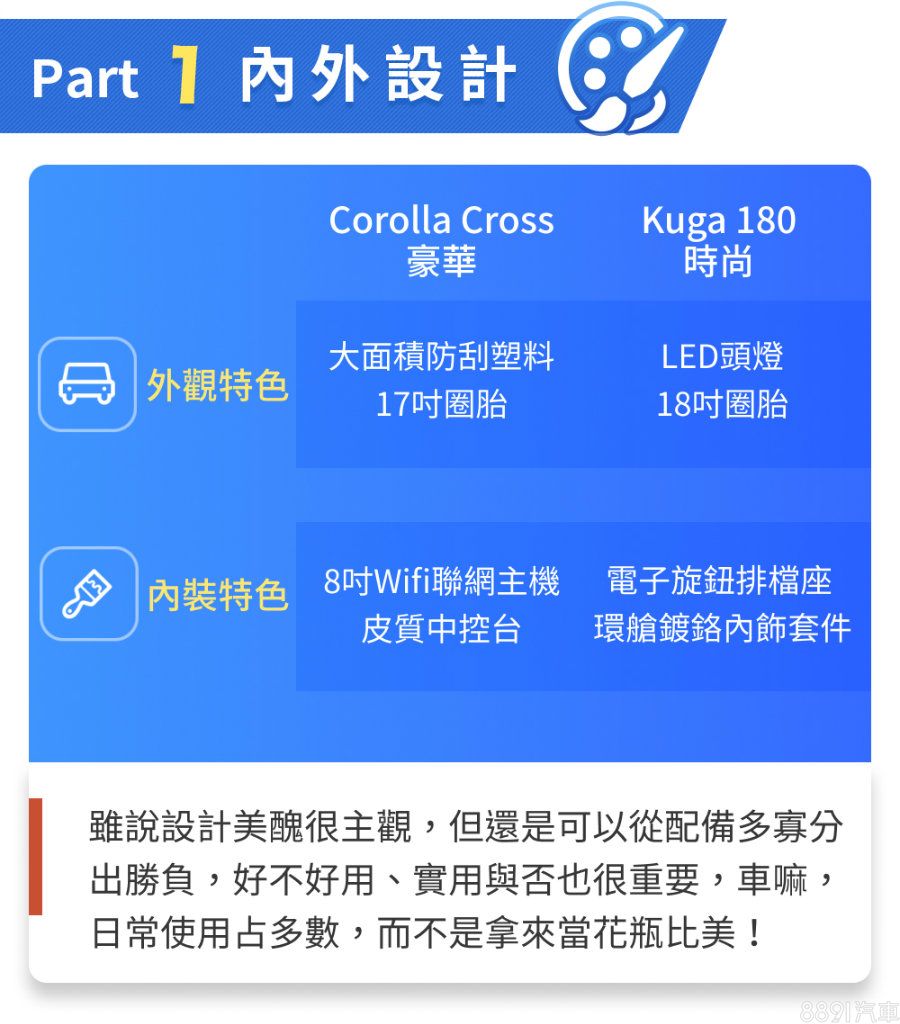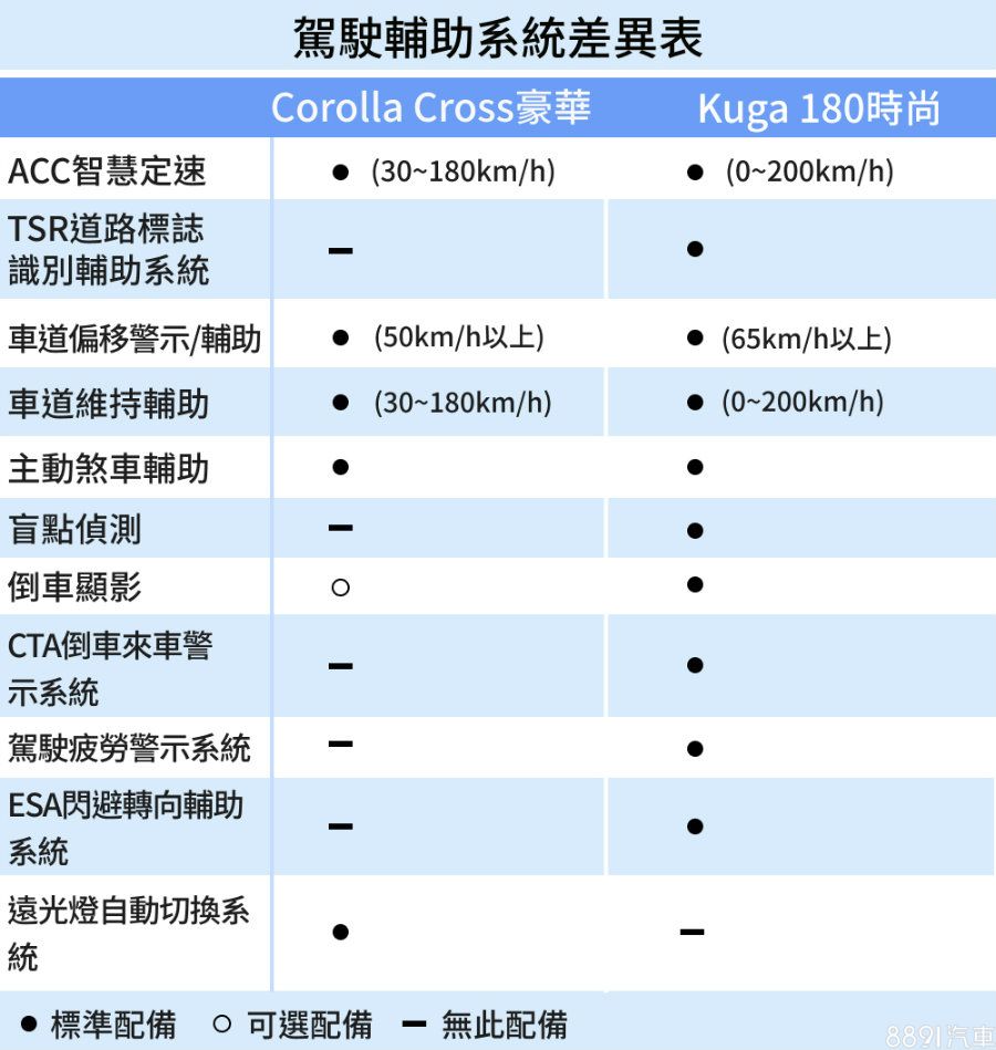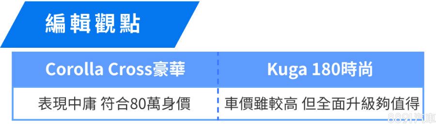 如果正在考慮80萬以上、甚至90萬等級的Corolla Cross,真的該看看高一級的中型SUV,就像這次同場比較的Kuga,除了動態表現完勝之外,空間更寬闊,車室配置與行路質感都更好,再加上完備的主動安全科技,很多地方是事後無法再加價升級的,從Corolla Cross升到Kuga,全面性提升的表現讓每一分價差都花得值得。
