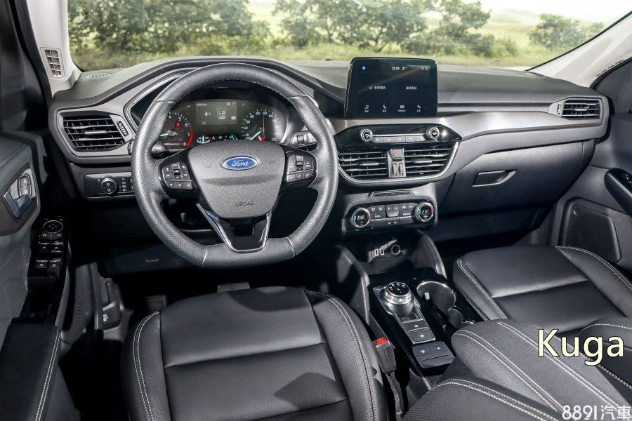 Kuga內裝和Focus幾乎如出一轍,設計新穎並帶有科技感,且藉由鋁質、鋼琴烤漆飾板及皮質包覆等材質運用,讓車室質感更上層樓;採用電子旋鈕排檔座讓空間變得更加開闊。另外,全車系都將電子手煞車及Auto Hold功能列為標配。