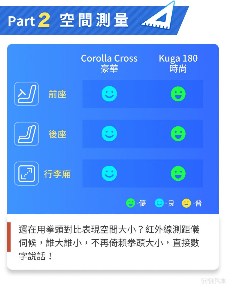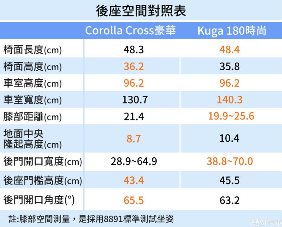 至於進出車室的便利性,Corolla Cross的高度與開口角度都稍微好一點,而Kuga則有明顯較大的車門開口,綜合空間的整體表現是Kuga更優秀。