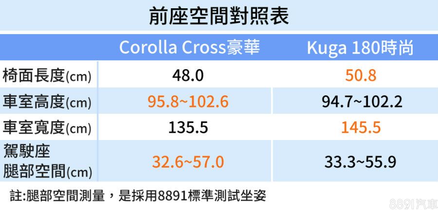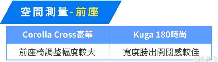 Kuga的椅墊長度更充足,有助於大腿支撐性,另外在寬度部分也比Corolla Cross多了10cm,開闊程度自然更好,Corolla Cross則是只有座椅前後調整幅度、車室高度表現略好一些,Kuga仍是發揮了尺碼較大的空間優勢。