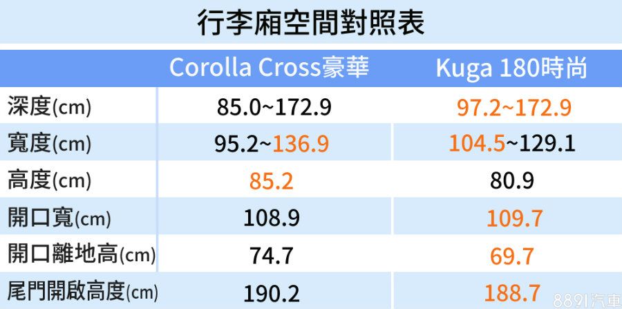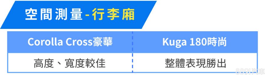 兩車在此等級價位都未配置電動尾門,Kuga的尾門開啟高度稍微低了一些,且開口離地高也相對偏低,開關尾門或搬運重物時會比Corolla Cross輕鬆。