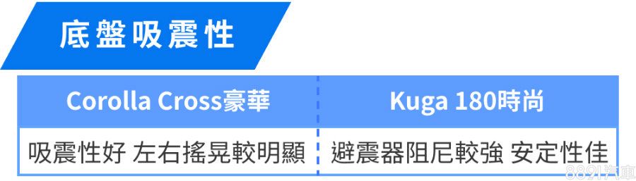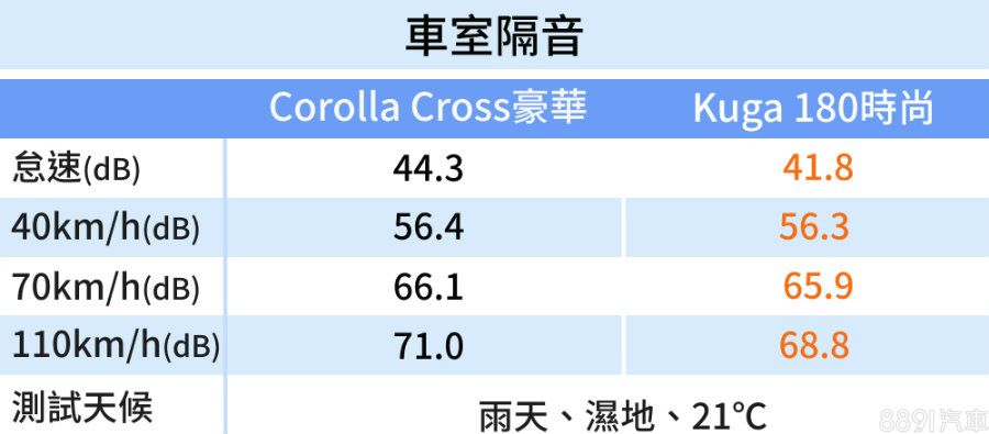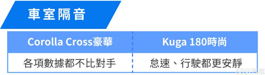 不論是數據實測還是感官體驗,Corolla Cross的隔音表現確實都不如Kuga來得優異。特別是高速行駛的風切聲,以及重踩油門從前方擋火牆傳來的拉轉聲浪,都是Corolla Cross比較明顯,車室寧靜程度比不上Kuga。