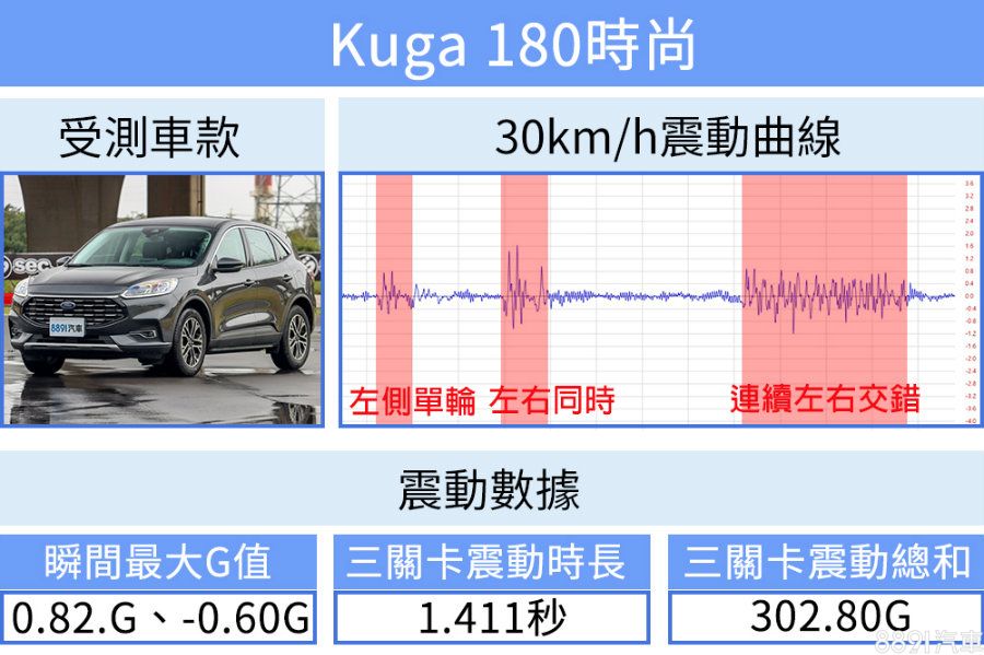 相較於Corolla Cross,Kuga的懸吊回饋較為柔韌紮實,衝擊感自然相對明顯,瞬間最大G值來到0.82G。而在連續左右起伏的考驗下,車身回穩速度快,也少有多餘的二次晃動,讓震動總和控制在302.80G,表現不俗。