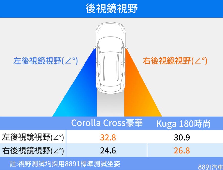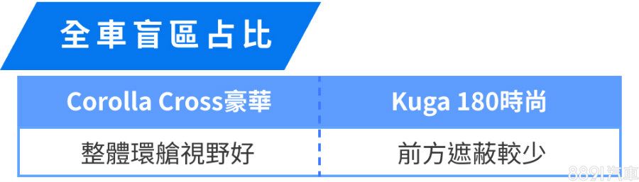 前視野由Corolla Cross小幅勝出,後視野則由Kuga扳回一城,主因在於Corolla Cross的車身腰線以小休旅而言偏高,且後窗面積窄小,連帶影響後方視野遮蔽範圍較大,比Kuga多了一倍,相當大的差距,同時又缺乏倒車顯影(需選配),倒車時一定要多留意。